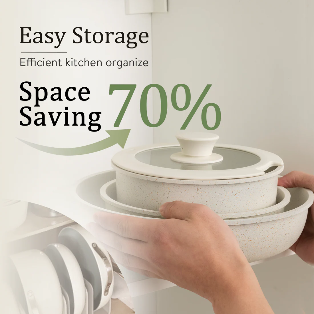 - Tối ưu không gian: Khi không sử dụng, bạn có thể tháo tay cầm và xếp chồng các nồi chảo lên nhau, giúp tiết kiệm tới 70% diện tích tủ bếp.