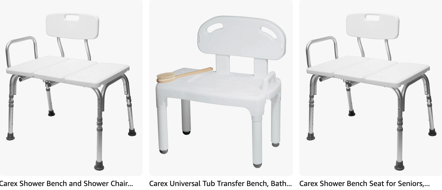 Đây là một trong những sản phẩm nổi bật nhất của Carex. Ghế được thiết kế để người dùng ngồi bên ngoài bồn tắm rồi trượt vào bên trong, thay vì phải bước cao qua thành bồn. Khung nhôm nhẹ nhưng chắc chắn, chân ghế có đế cao su chống trượt, mặt ghế rộng và thoát nước tốt. Sản phẩm đặc biệt phù hợp cho người lớn tuổi yếu chân, người sau phẫu thuật hoặc người cần hỗ trợ khi tắm.